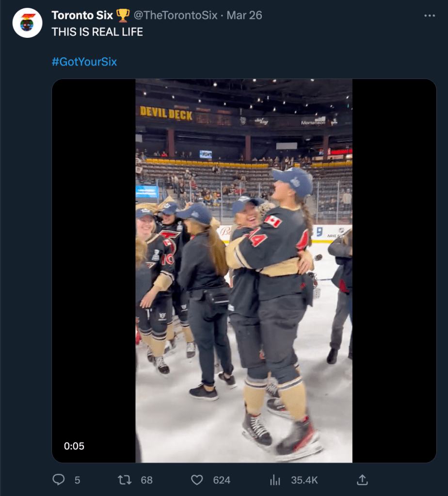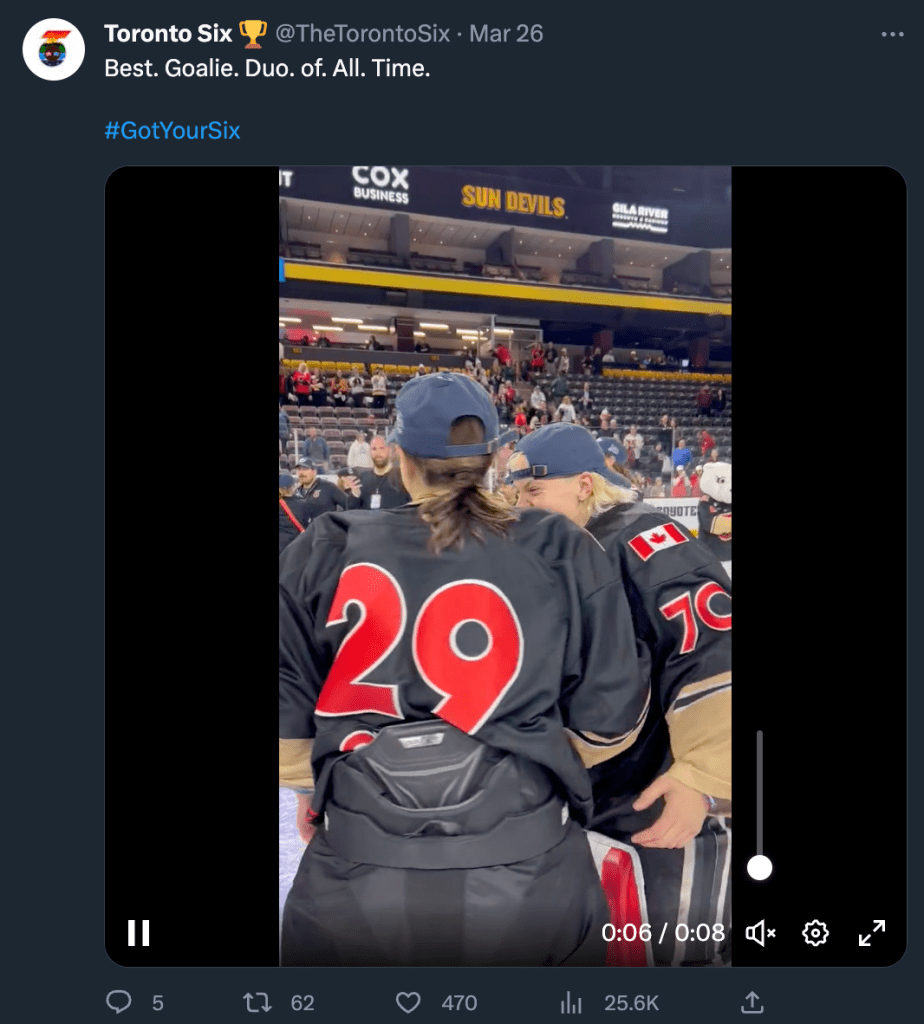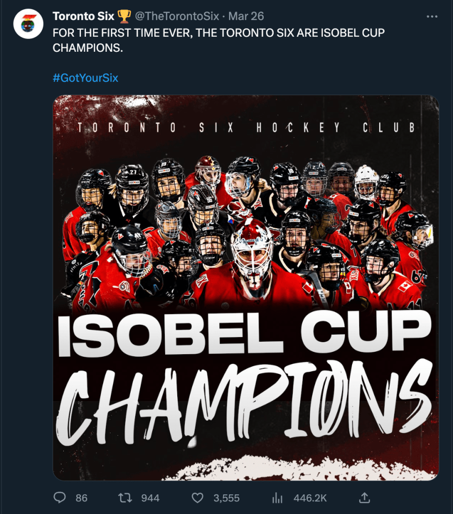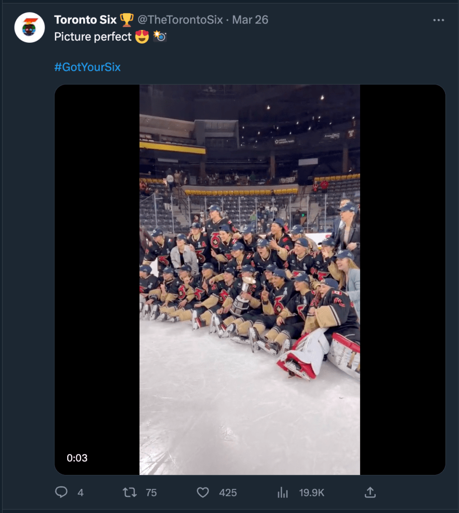 From February to July of 2023 I served as the social media manager for the Toronto Six Hockey Club of the Premier Hockey Federation. This included on-site work through their entire Isobel Cup Championship playoff run through to the championship win on March 26th and the subsequent celebration.