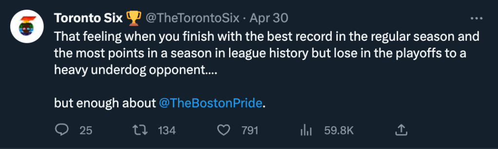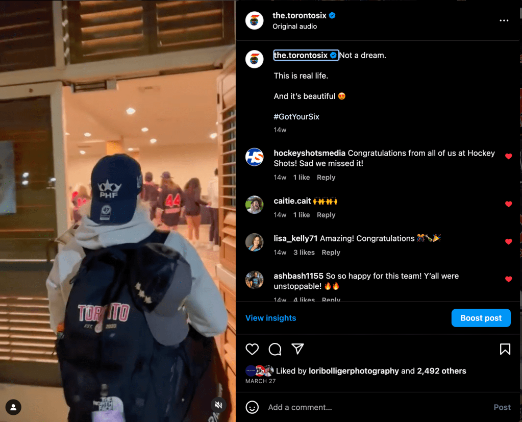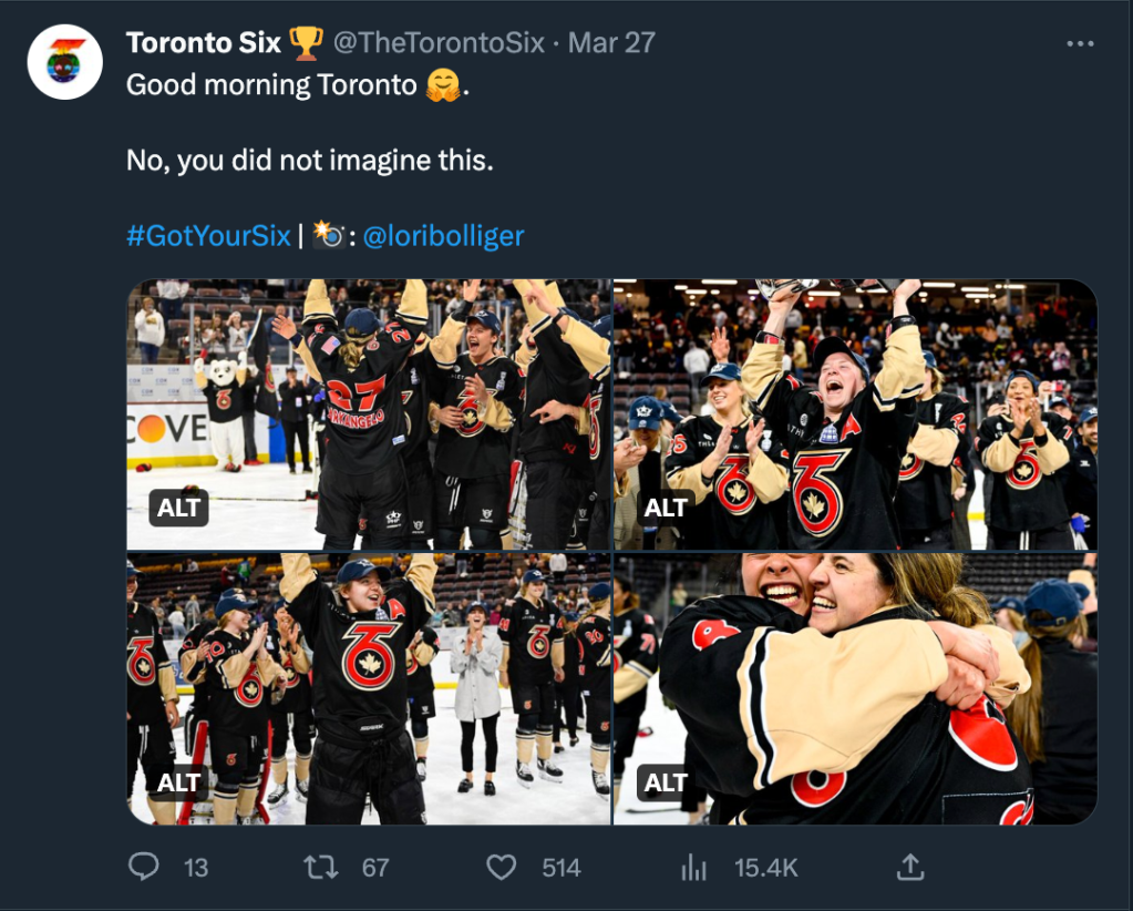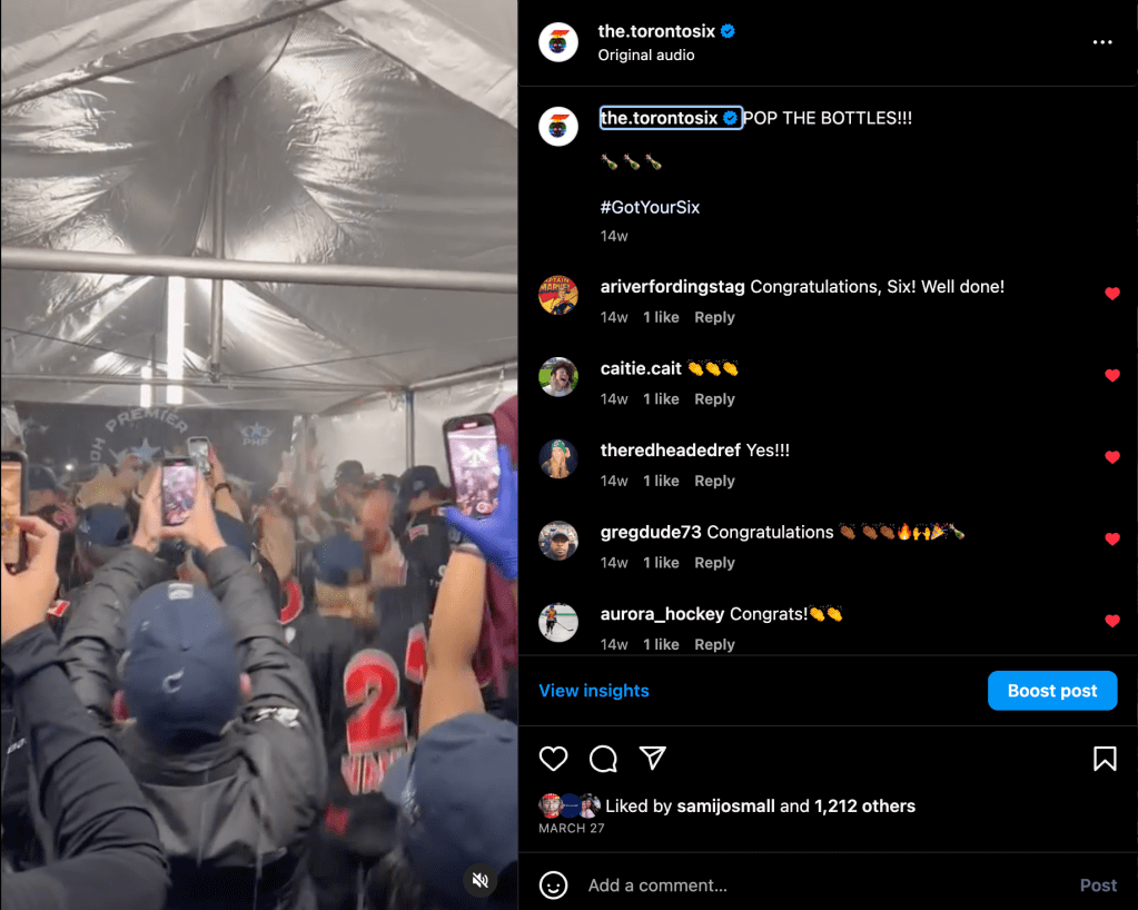 From February to July of 2023 I served as the social media manager for the Toronto Six Hockey Club of the Premier Hockey Federation. This included on-site work through their entire Isobel Cup Championship playoff run through to the championship win on March 26th and the subsequent celebration.